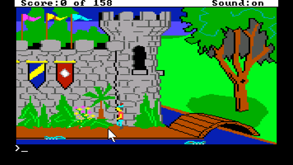 Aus heutiger Sicht macht King’s Quest graphisch natürlich nicht mehr viel her. Aber wenn man bedenkt, dass die Alternative reine Textadventures war, so muss das Spiel sein damaliges Publikum schlicht aus den Socken gehauen haben. Sir Graham kann sich vollkommen frei im Raum bewegen, alles ist bunt und selbst die Krokodile im Burggraben sind animiert.